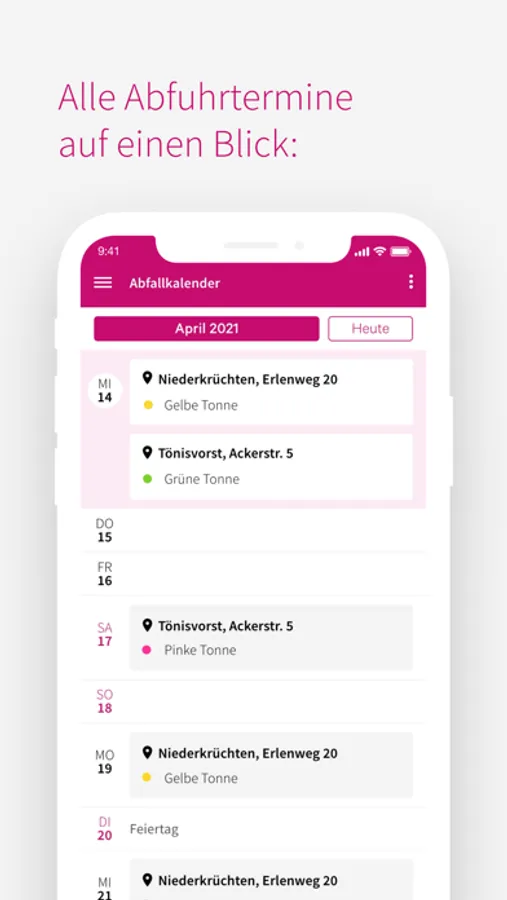 Die neue Adressverwaltung ermöglicht es, mehrere Adressen einzugeben. So können Sie sich an verschiedenen Standorten erinnern lassen. Oder für Verwandte oder Mieter die Tonnenleerungs-Termine mit verwalten.