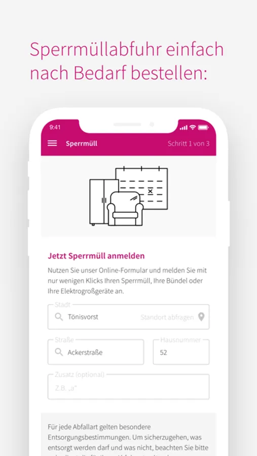 Sperrmüll und Elektrogroßgeräte melden Sie online an und wählen auch gleich den passenden Abholtermin aus. Eine Bestätigung zur Abholung erhalten Sie automatisiert.