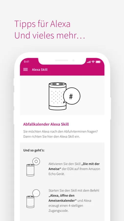Auch Ihre Alexa können Sie bequem und schnell von der App aus einrichten. Mit wenigen Klicks ist der Sprachdienst bereit, Ihnen alle Fragen zur Tonnenleerung zu beantworten.