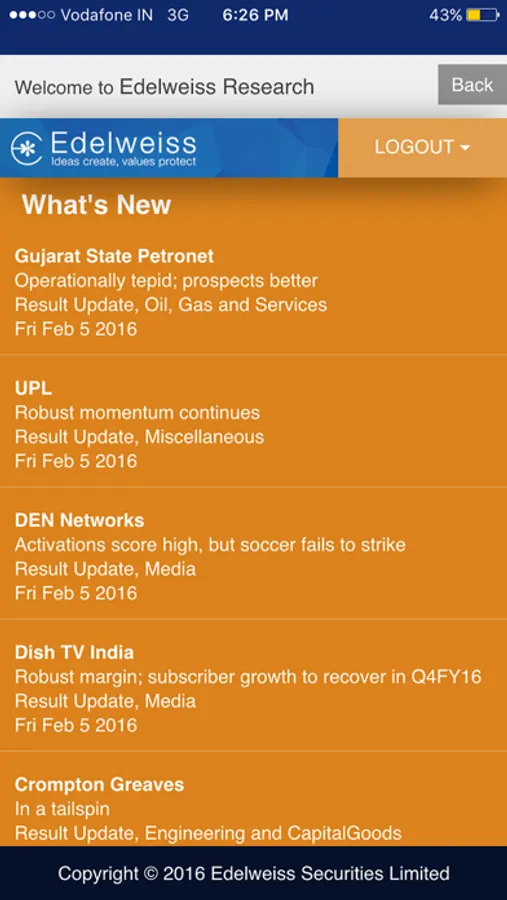 The ERA (Edelweiss Research Application) offers our institutional clients easy, real-time access to all of our equity research.Our research covers India’s growing industries and companies of IT, Telecom , Banks, NBFC, Auto, Metals & Mining, Cement, Oil & Gas, Capital & Engineering goods, Defence, Infrastructure, Construction, Pharmaceuticals, Fertilizers, Abrasives, Bearings, Credit Rating, FMCG, Media, Retail, Aviation, Hotels, Logistics, Textiles and Miscellaneous.