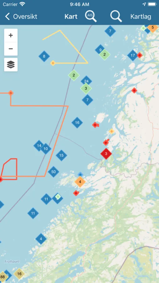 FiskInfo brukes for å se innhold fra BarentsWatch sine FiskInfo sider direkte på iPhone. Vis kart over redskap i sjøen, havbunnsinnstallasjoner, iskonsentrasjon eller planlagt og pågående seismikk. Også AIS data fra fartøy kan vises i kartet.