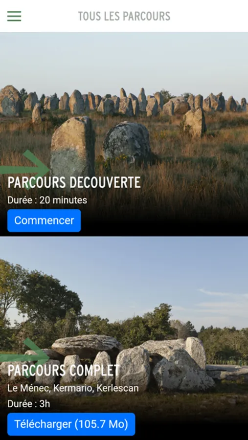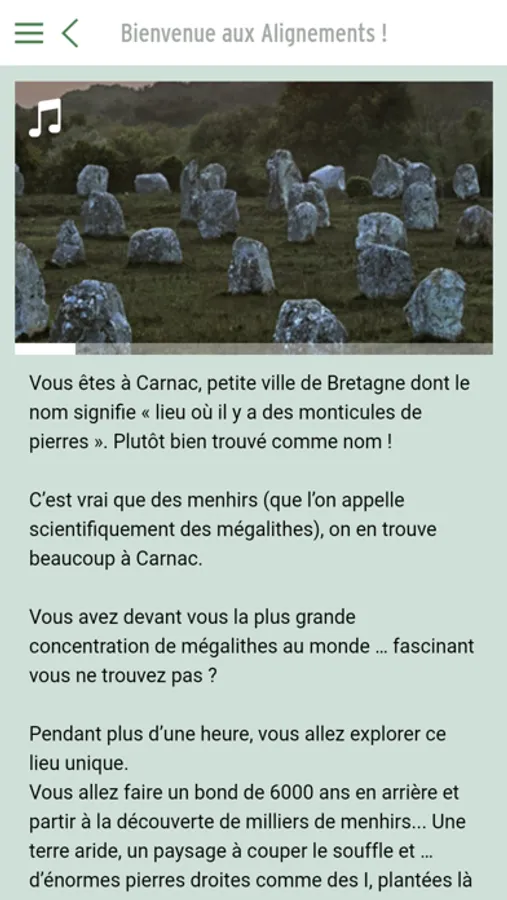 Explorez les alignements du Ménec, de Kermario et de Kerlescan qui appartiennent à ce lieu unique. Vous allez faire un bond de 6000 ans en arrière et partir à la découverte de milliers de menhirs. L'application de visite présente une carte avec géolocalisation, des contenus audio, des photos pour mieux repérer certains détails du parcours.