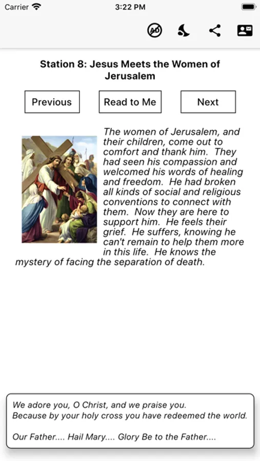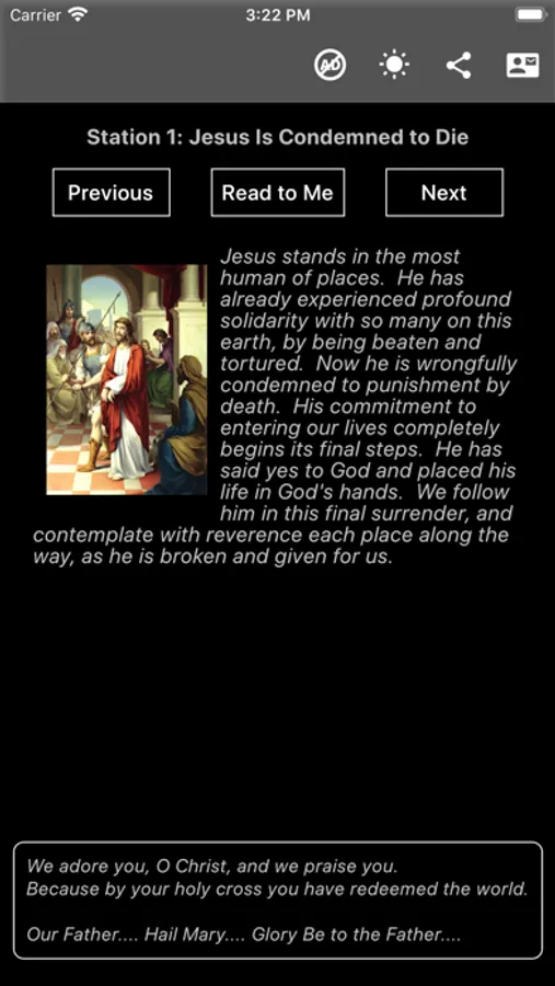 This app is developed for you to have easy access to the fourteen stations anywhere you go and at anytime. You may also choose to share any station in which you find particularly meaningful to your friend and family members easily via the app. There is also an optional dark theme which improves reading in the dark. (Tap on top left icon to toggle it)