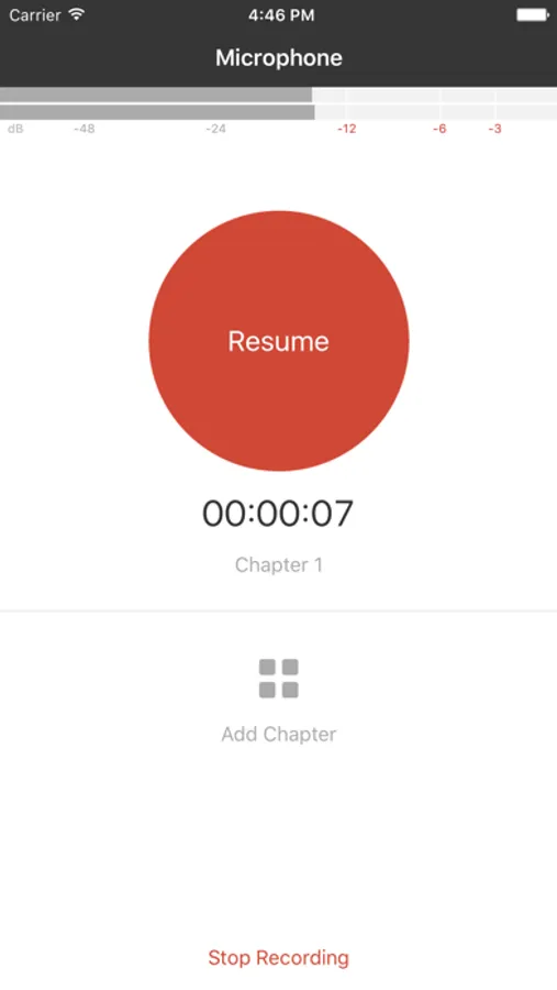 Our recording interface displays the current maximum peak level, you can add and edit chapter markers and it also records in background while using other apps.