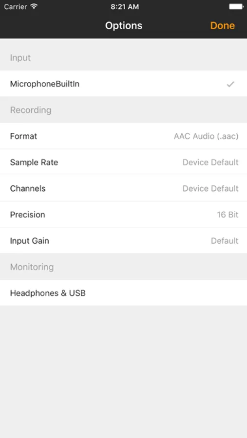 Record your raw microphone signals without any iOS pre-processing, in an uncompressed (PCM audio) or compressed (AAC) format, written to disk every moment to avoid data loss if the app gets killed.