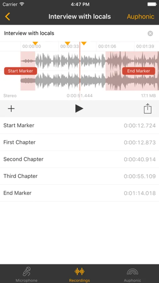A simple editor shows the recorded waveform, where you can edit start/stop and chapter markers, export and process the audio file using the Auphonic web service or share it with other iOS apps.