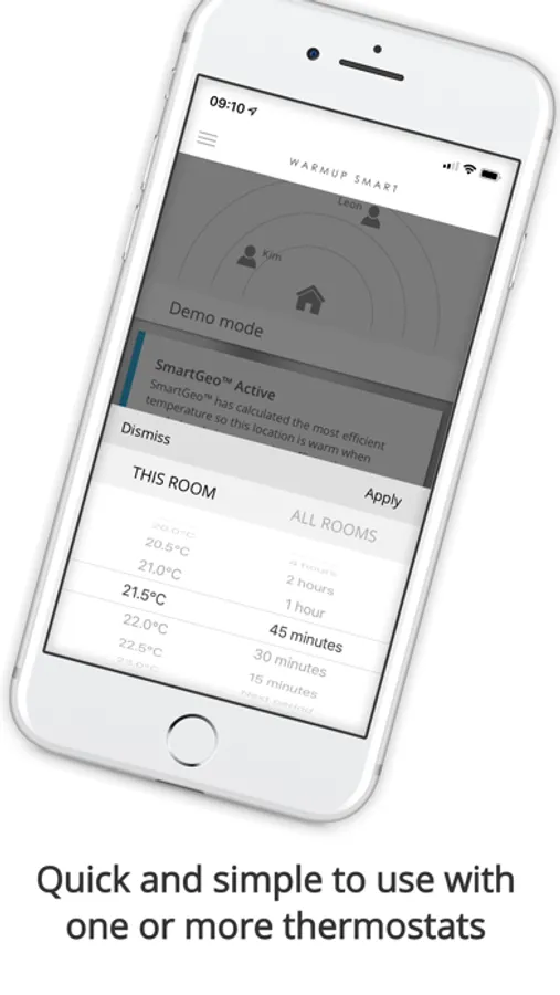 MyHeating works with your Warmup Smart WiFi Thermostat to keep your house at the right temperature and reduce your energy use automatically. It uses the location services already built in to your smartphone to calculate in the background how long it will take you to get home and set the temperature accordingly, so your home is automatically comfortable when you're there and always running efficiently.