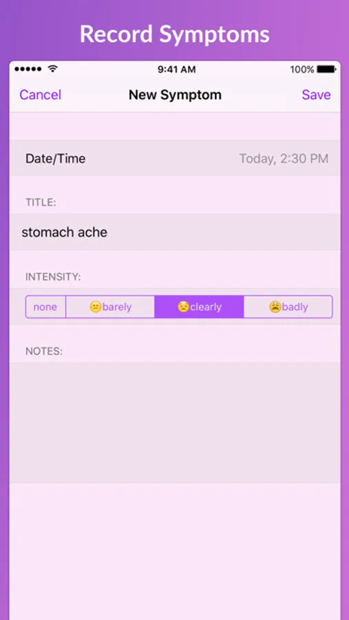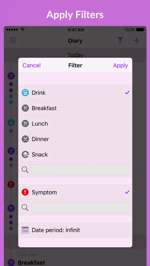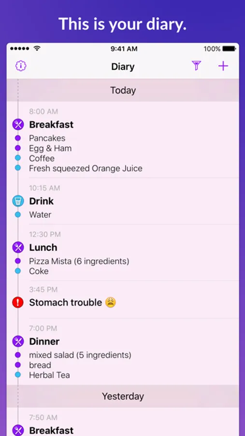 Entering the same over and over again is cumbersome. Foody helps you with a custom prediction bar above the keyboard. It suggests your most used symptoms, foods, drinks and even ingredients so entering common items is only a matter of seconds.