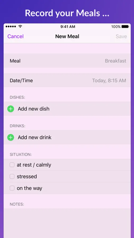 - Mark your meals as breakfast, lunch, dinner or just snacks and drinks in between.