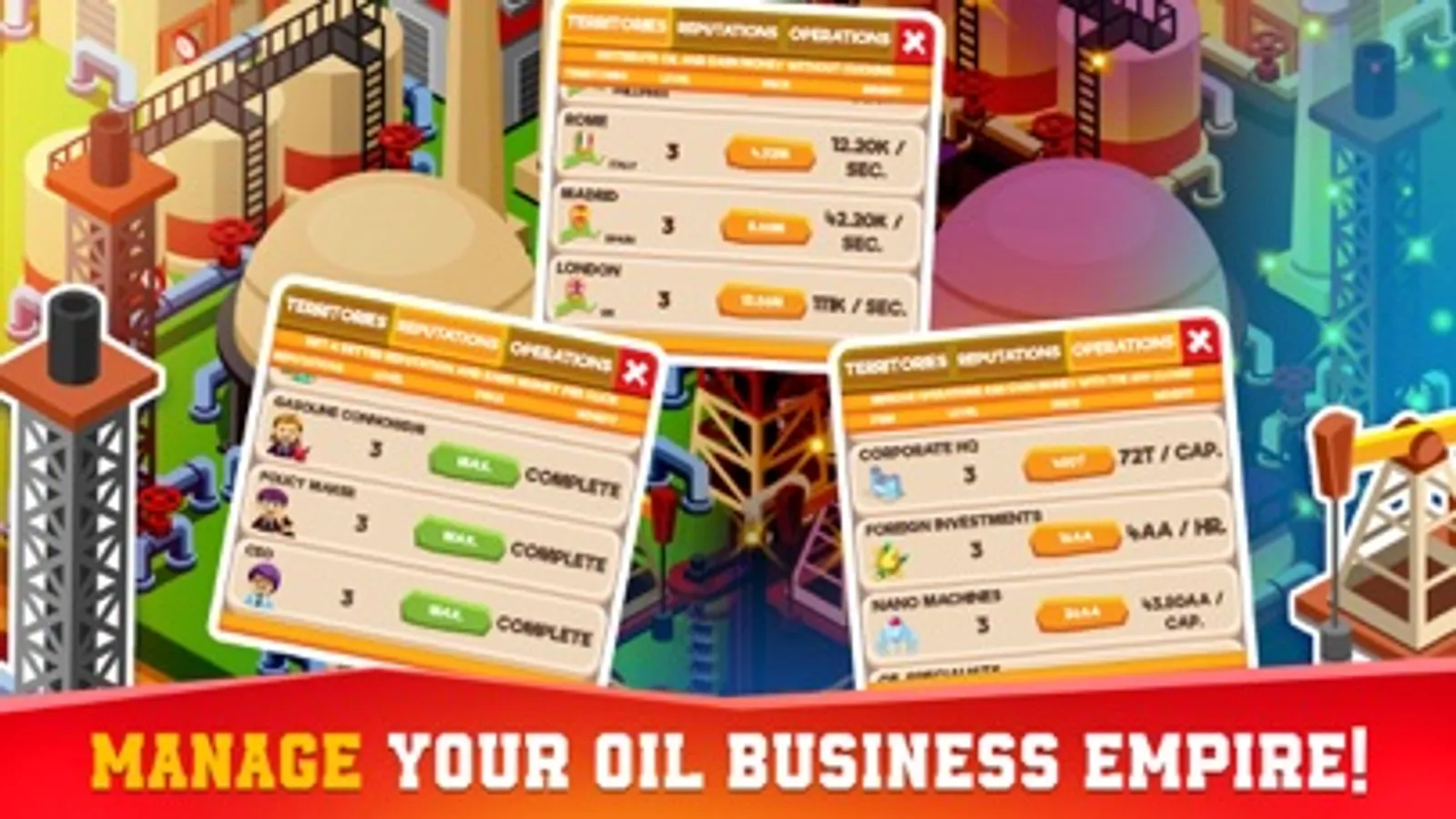 Oil Tycoon is free to play incremental tycoon clicker game. We're always listening to all feedback we receive! We want to make Oil Tycoon the absolute best Tycoon and idle/incremental game and your feedback helps us reach that goal. We read *everything* you send us, so please let us know what you'd like to see! :)