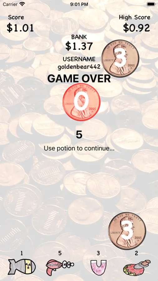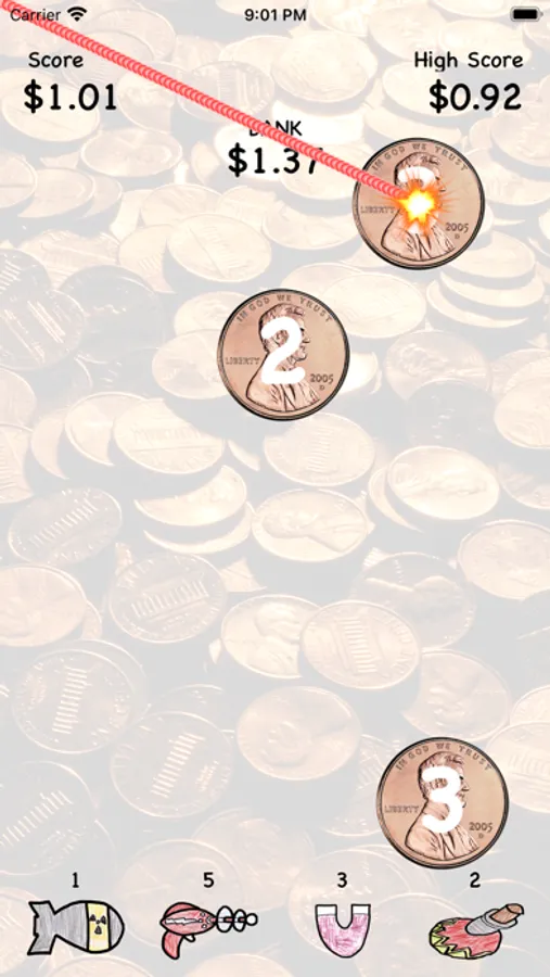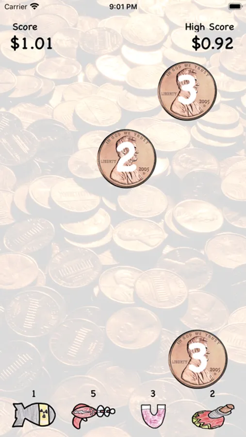 We found that just one coin on the screen was too boring, so it starts with two coins, but gets harder.