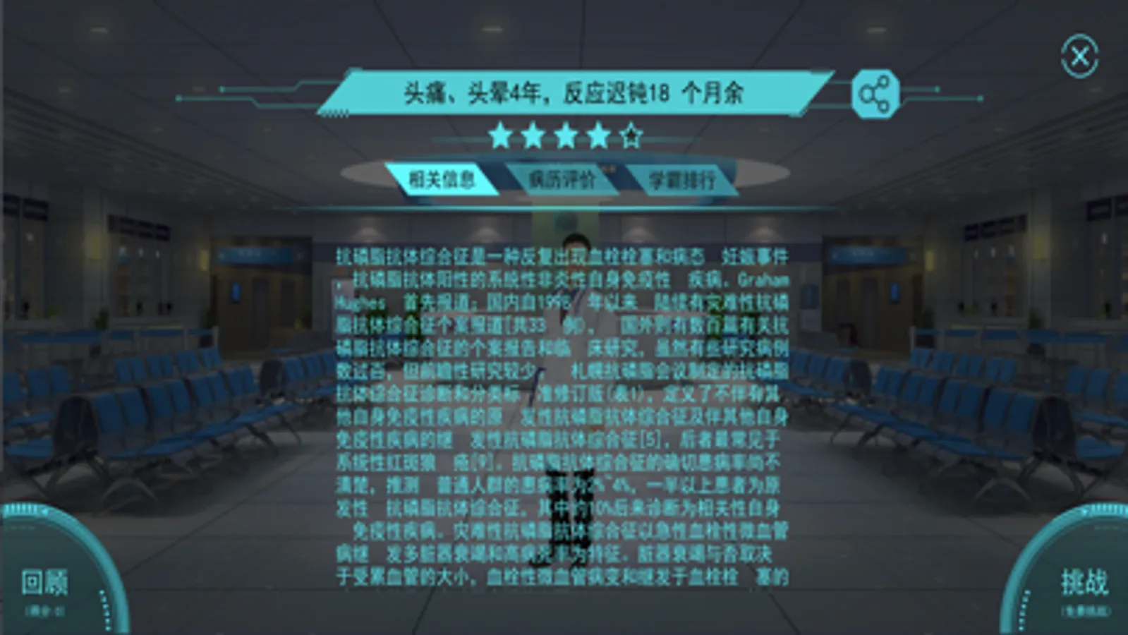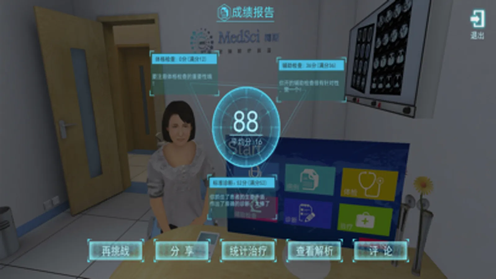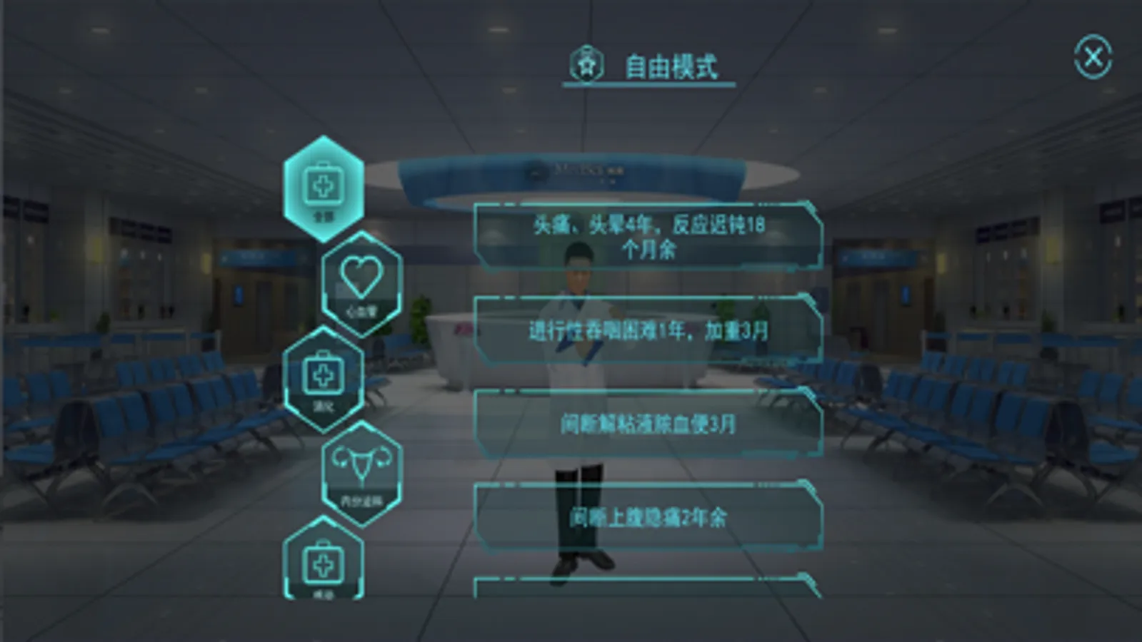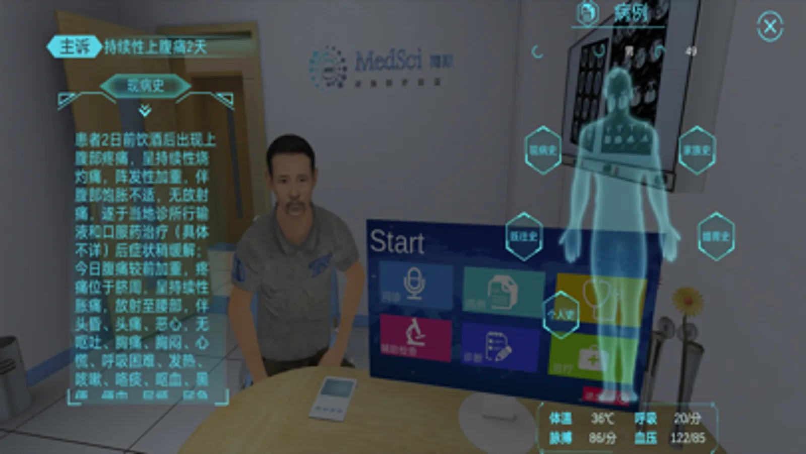 通过多媒体技术,将患者就诊过程和医师检查及诊断过程虚拟化,通过事先设定的病例,通过用户在软件中通虚拟人物的交互,进行模拟的病情采集及诊疗过程。比起传统的习题训练,更为灵活,获取所需支持诊断信息的过程基本开放。用户可以通过此训练,培养对各类疾病的诊断思路,并且可以在更直观的软件使用中,接触到较多的经典病例。