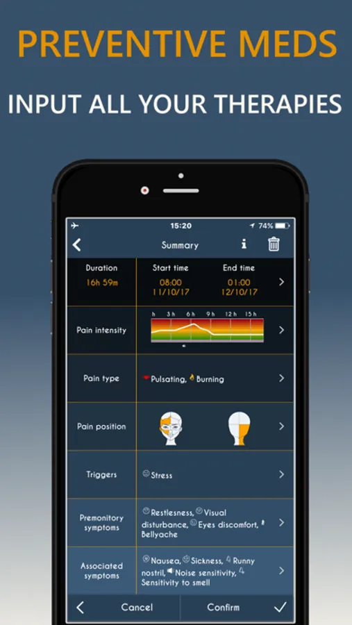 It replaces the paper headache diary that headache doctors suggest patient to fill in order to have a correct diagnosis and appropriated therapy. HeadApp! helps you also to discover your triggers and prevent an attack.