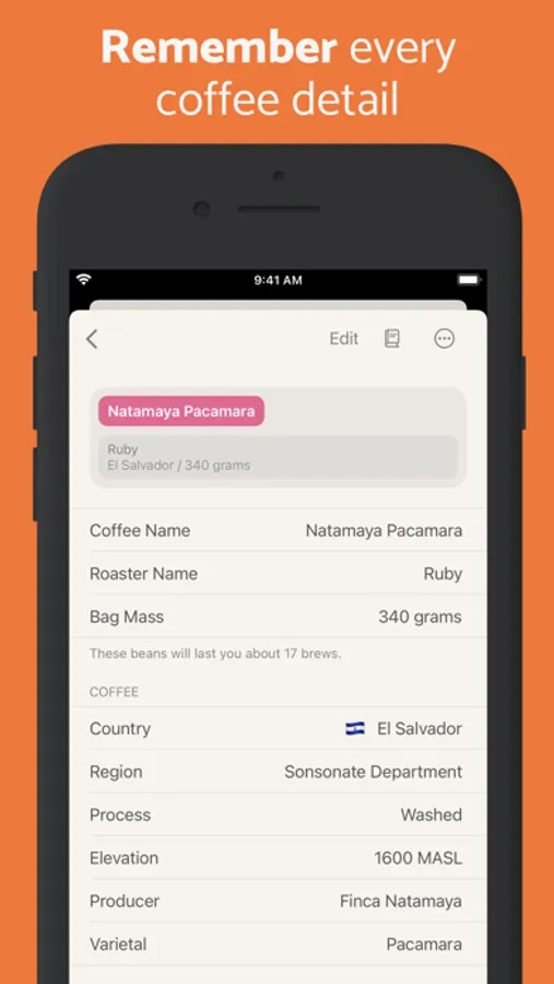 Brew Timer comes with detailed coffee tracking built in. You can track everything from the simple "Name" and "Roaster", to the more fine-grained details like "Varietal" and "Harvest Date". To save you from typing it all out, on iOS 15 and later Brew Timer supports scanning coffee bags to automatically extract these coffee details for you.