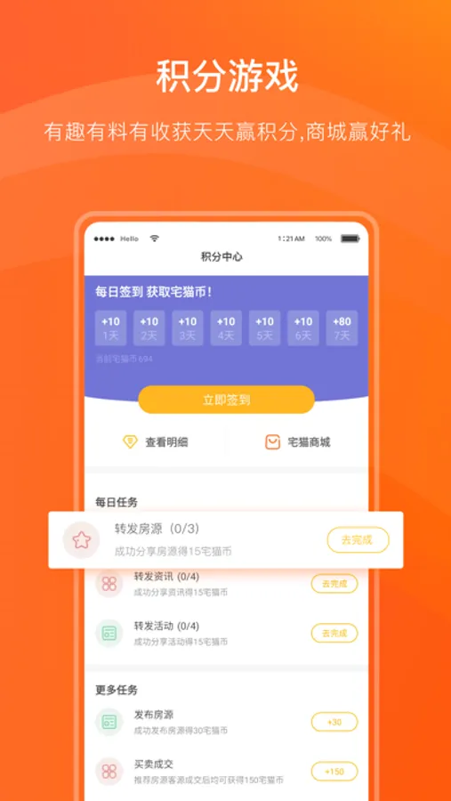 •收获丰收的额外收入宅猫物业邻里可以帮助您通过利用碎片时间所进行的经营,获取更多的经济收入。与宅猫携手,充分利用自身的资源参与社区房产交易服务,打破社区房产盈利瓶颈,让物业收入再多一点。