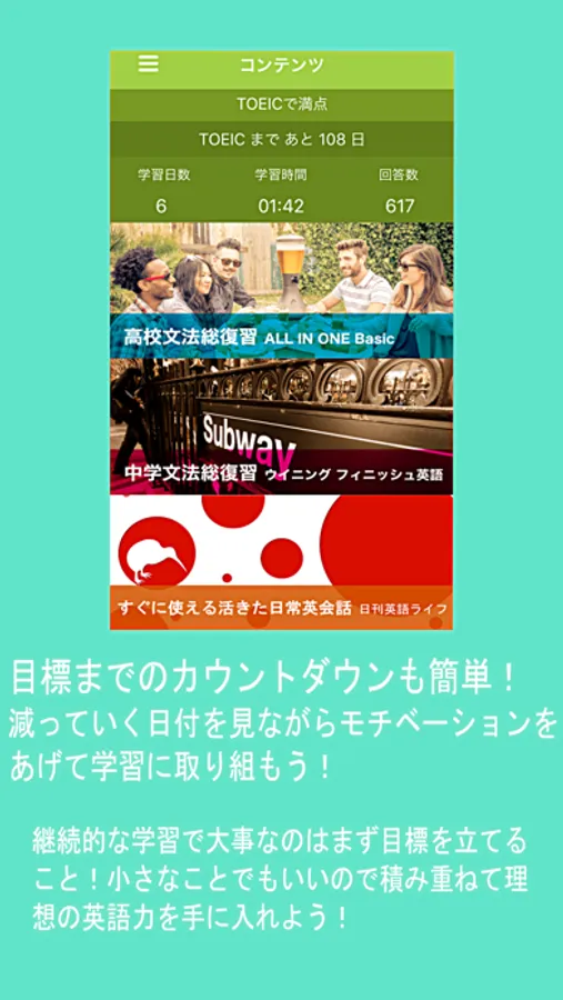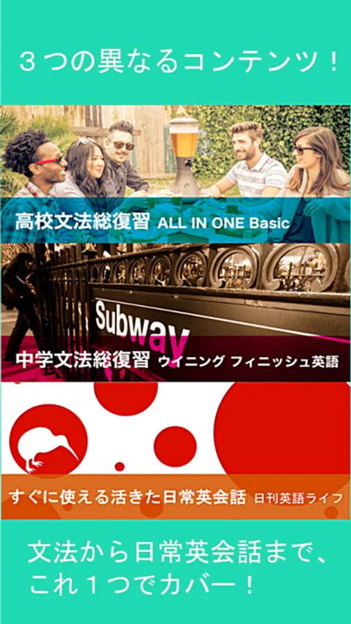 コンテンツは、人気英語学習書籍の「ALL IN ONE Basic」や、人気WEBマガジン「日刊英語ライフ」、中学生向け学習塾教材「ウイニングフィニッシュ英語」の協力を得て、充実した内容となっています。