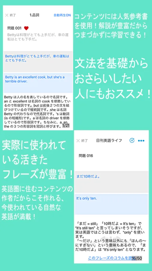 コンテンツは、中学、高校の英文法、英単語から、実際にネイティブスピーカーが良く使う日常英会話表現まで幅広くカバーしています。