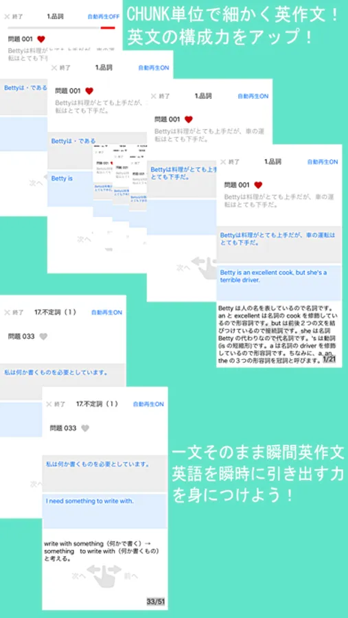 現時点で英文法を学習しているというかたも、並行して行う事で、早期に英会話に生きる英語力を身につける事が出来ます。また、英単語や英熟語を強化したい、または知っているのだけど上手く英会話の際に出て来ないという方も、アプリ内のそれぞれの英作文を行う事で、使いたい時に使いたい言葉が出てくる英語脳をつくることが出来ます。