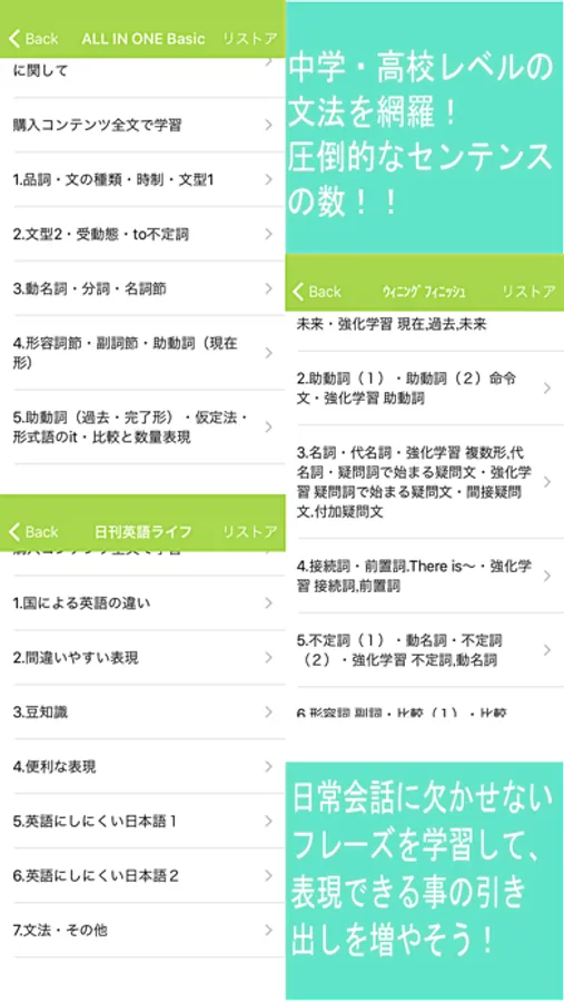 (各コンテンツ50文ずつ、お試しできる無料のコンテンツを用意しています。)