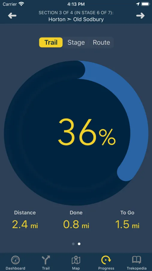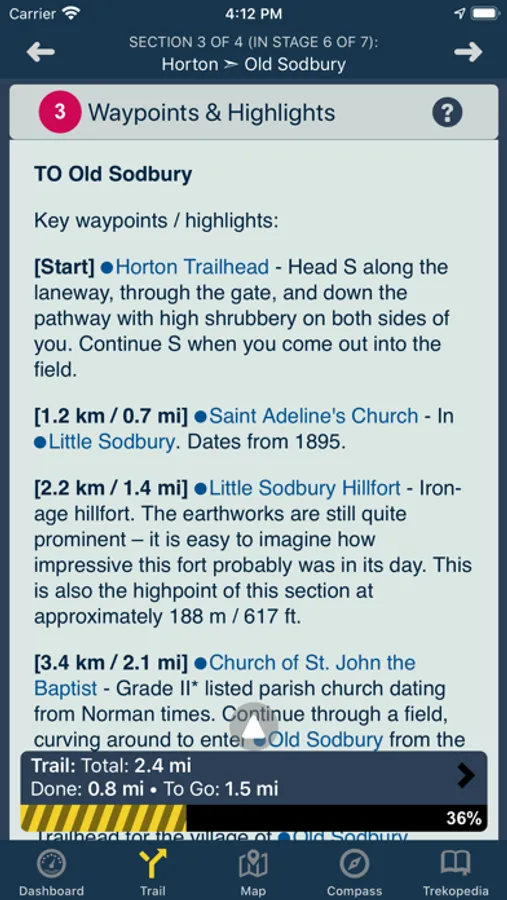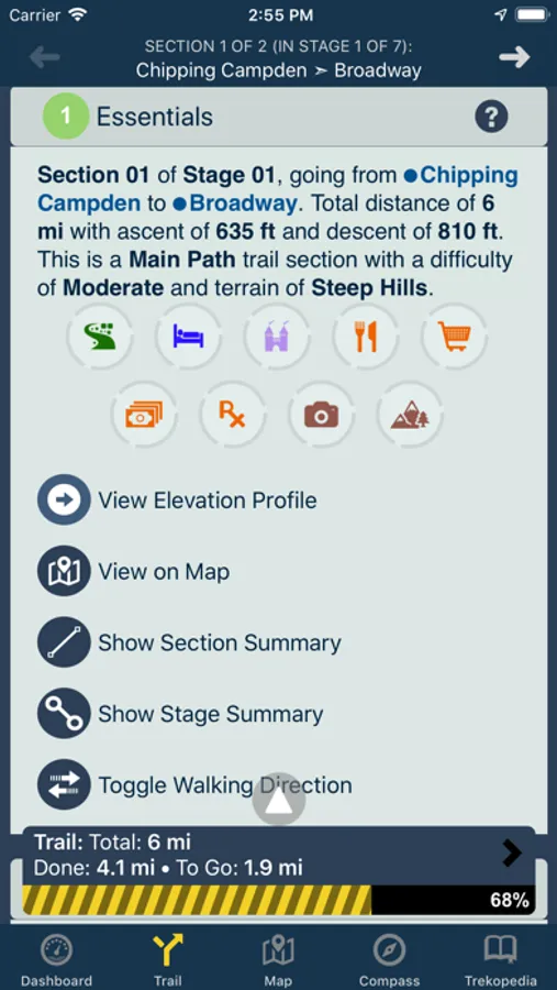 It includes an in-depth reference 'Trekopedia' (communities, B&Bs / hotels, attractions, services, points of interest, etc.), supports customizable routes, interactive maps (including detailed offline maps), directions and section-by-section guide, dynamic trip stats for your current section, stage, and route, an intelligent compass that shows the right direction based on your current location and chosen route, and more.
