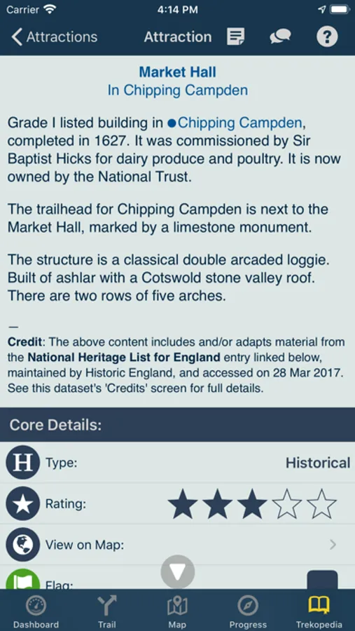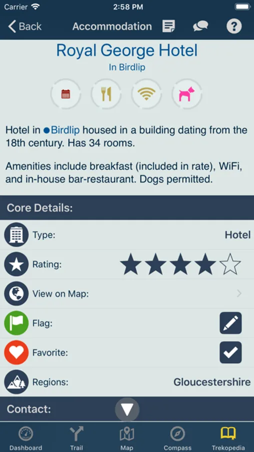 TrekRight’s ‘Cotswold Way Encyclopedia’ is packed with extensive interactive reference information. Everything can be searched and filtered, viewed on a map, notes can be added (anything from a simple reservation number to a copy-and-pasted blurb from a website), and more. Handy information (literally) at your fingertips!
