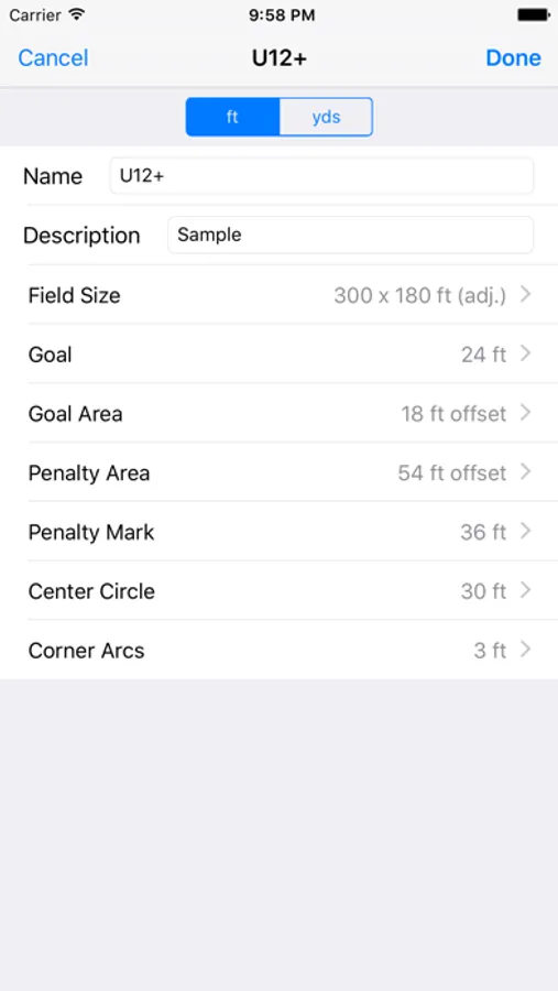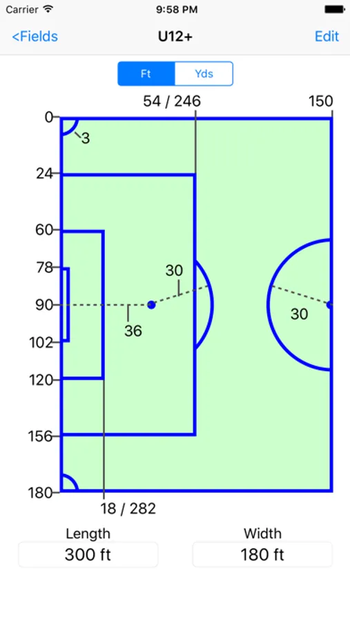 * Adjust field length/width on the fly - and the measurements update automatically. Perfect for when the desired field size doesn't quite fit.