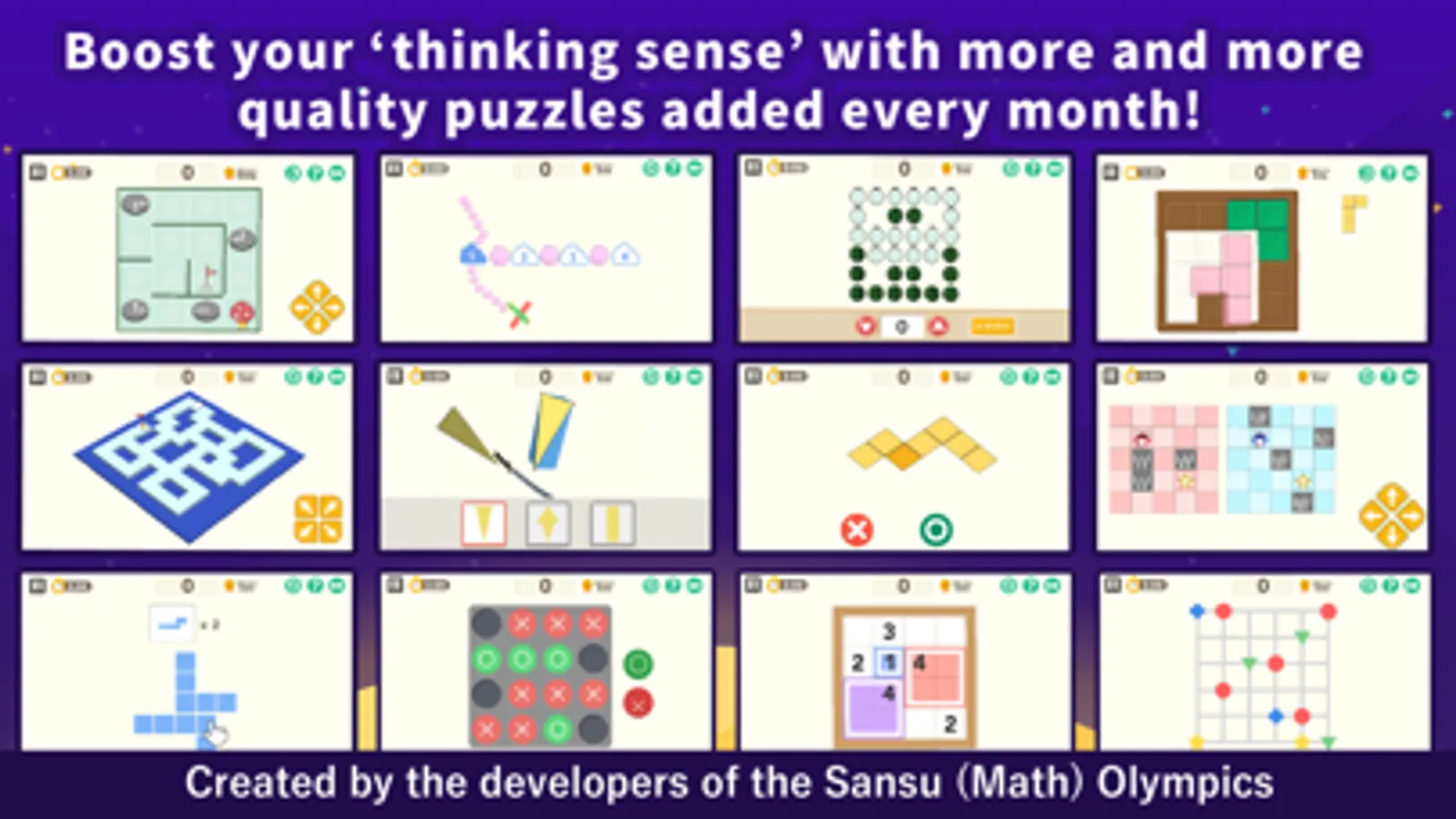 Think!Think! is an educational app that uses puzzles, mazes, and mini games to foster children's thinking skills in a fun and entertaining way! All of its educational contents are developed by a professional team of teaching experts who also design problems for the International Mathematical Olympiad and the Global Math Challenge. Findings from a joint research study confirmed that the use of the app increases math scores and IQ scores of its users (please visit our website for further details). We are constantly conceiving new content every month, adding to the current 120 mini-games and 20,000 puzzles!