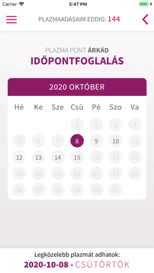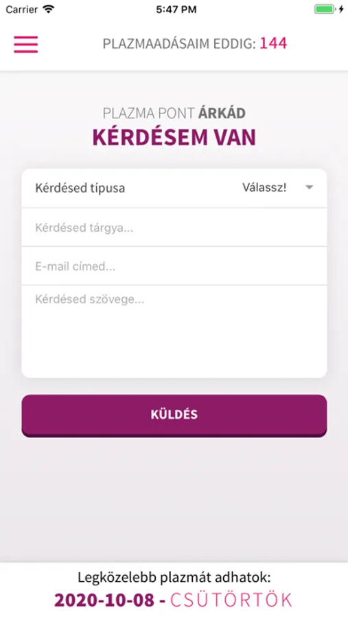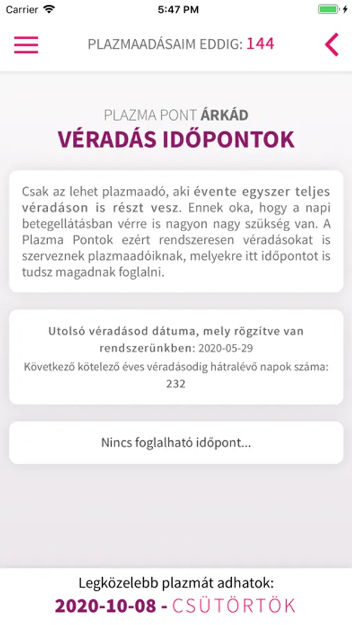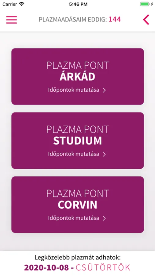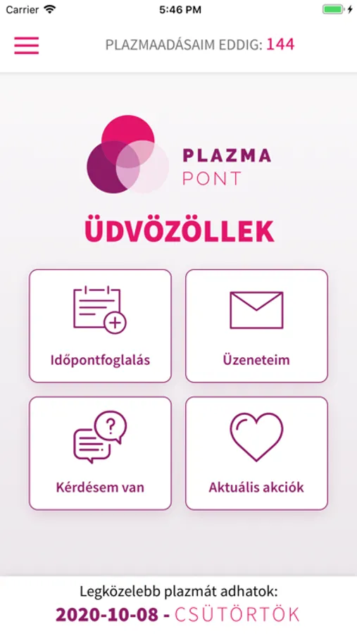 Alkalmazásunk valós idejű online bejelentkezést tesz lehetővé plazmaadóink számára! Ha Te is plazmaadónk vagy, akkor töltsd le alkalmazásunkat, hogy kipróbálhasd az időpontfoglalás új és gyors formáját. A bejelentkezéshez és időpontfoglaláshoz elegendő megadnod donorszámod, valamint születési dátumod. Szegedi plazmaadóink belépés után választhatnak, hogy Mikszáth utcai vagy Kígyó utcai Plazma Pontunkra szeretnének maguknak időpontot foglalni. Budapesti plazmaadóink pedig a Studium, Corvin és Árkád centrumok közül választhatnak időpontfoglalás előtt.