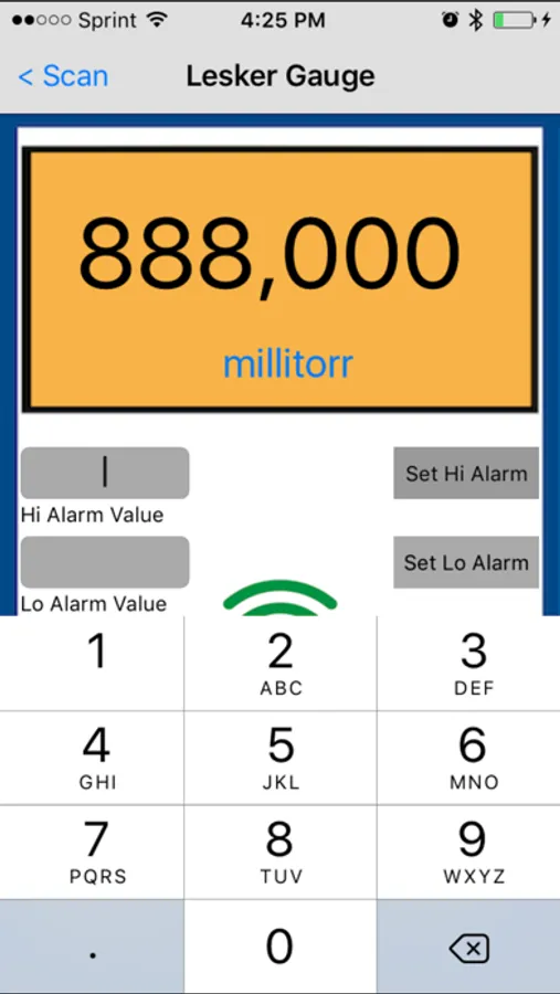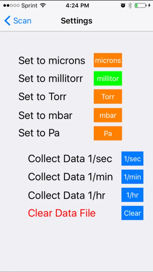 Alarm Feature: Many portable gauges have this, but having this via a Bluetooth connection is much more useful. The portable gauge alarm requires you to be right there to hear it. This Lesker gauge App alarm can be set at any value between 1 millitorr and 760,000 millitorr. When the vacuum level falls below this value the alarm will sound on your tablet or smartphone alerting you when the target vacuum pressure level has been reached.