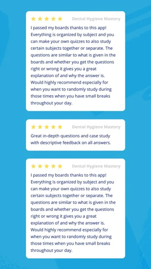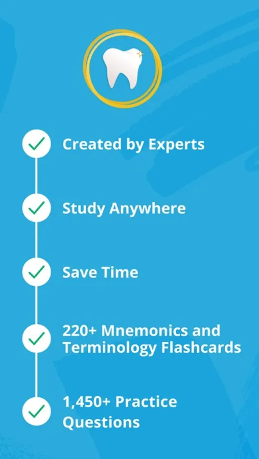 Install Dental Hygiene Mastery NBDHE – the FREE version today and start your studying! We provide a limited free version of the app that you can try before deciding to upgrade. Our practice test questions and basic progress metrics will help you learn anytime, anywhere!