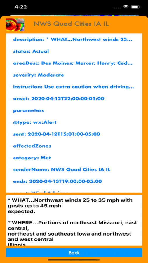 3. Click on any Alert and the app will automatically zoom into the alert area. Click on the information button to see the alert details.