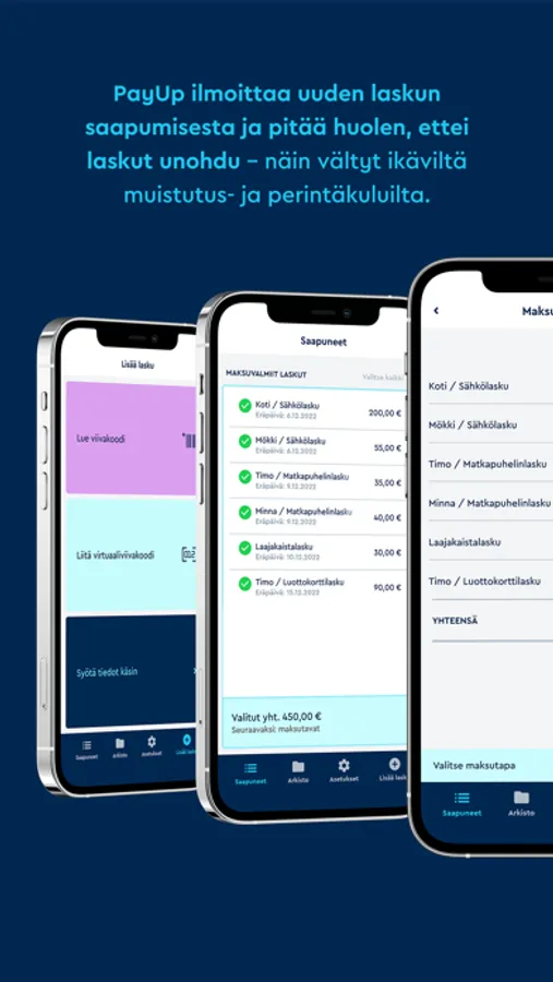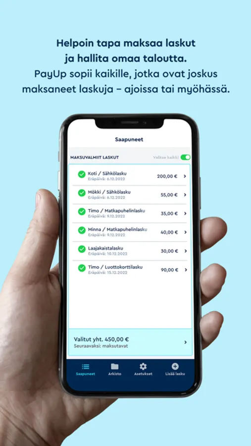 Palvelu sopii kaikille, jotka ovat joskus maksaneet laskuja – ajoissa tai myöhässä. Unohda laskuttajan asiakaspalveluun jonottaminen, PayUp antaa tarvittaessa myös lisää maksuaikaa. Palvelun käyttöönotto tapahtuu yhdessä hujauksessa.