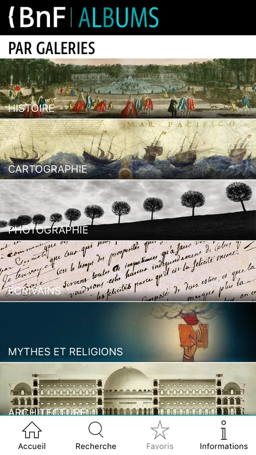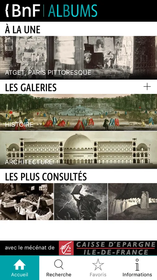 Une centaine d’albums commentés est proposée au moment du lancement de l’application, organisée en dix galeries. L’offre sera enrichie d’une vingtaine de nouveaux albums chaque année. Les sujets sont très variés : les jardins, les représentations du paradis, les dieux à travers les vases grecs, les journaux de tranchées, les brouillons d’écrivains, la genèse d’un Amour de Swann, les cartes marines, les illustrations des Mille et Une Nuits… Une application gratuite grâce au mécénat de la Caisse d’Epargne d’Ile de France.