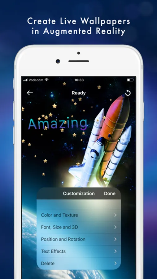 Add photos, text, videos, symbols and draw in Augmented reality. You can also fully customize everything you add. Choose from an amazing selection of backgrounds, textures and colors to make your Live Wallpaper look beautiful.