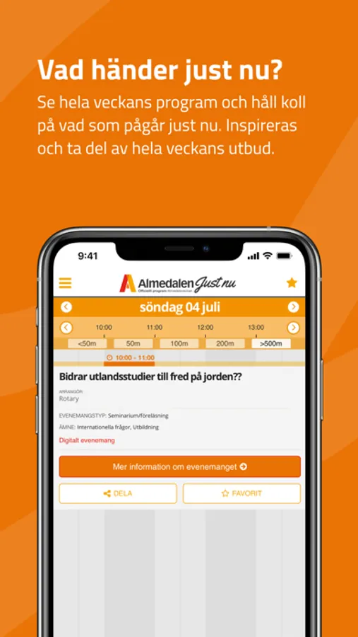 I funktionen - Vad händer Just nu? - får du en överblicksbild över vilka evenemang som börjar inom närtid. Vad händer Just nu? är en inspirationstjänst om du får tid över och vill få en överblick vad som är på gång.