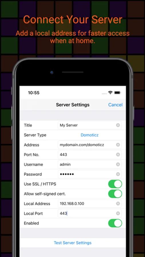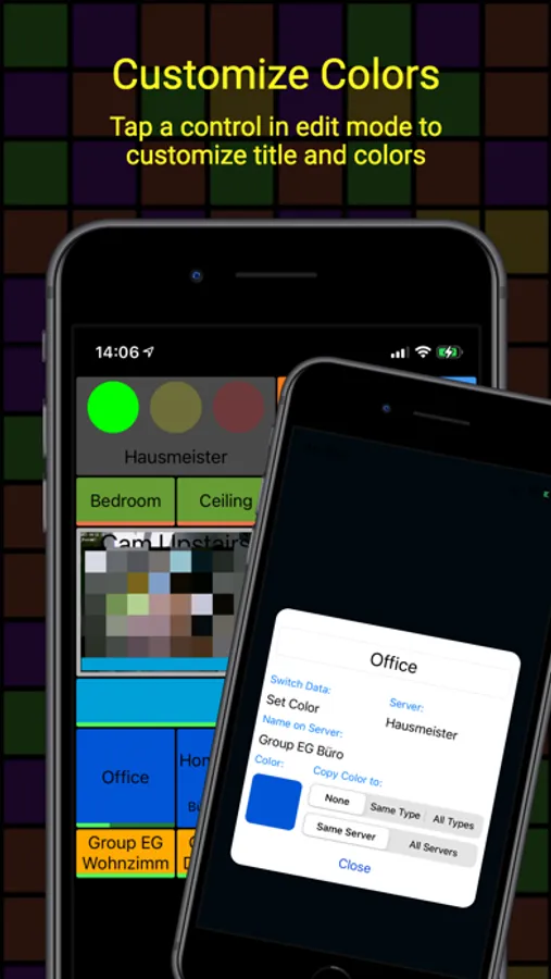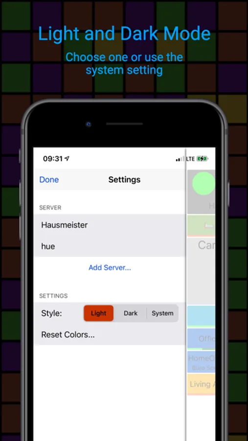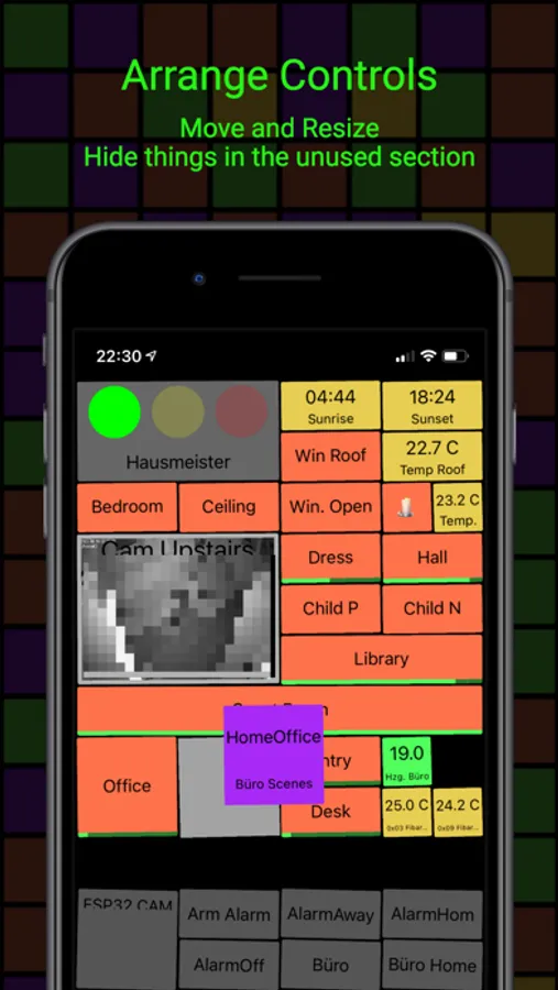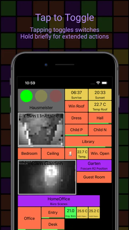 With Lights & Switches, you can connect one or more (**) home automation servers (*). You can then arrange each control available in the server (like light switches, dimmers or temperature readouts) by resizing or changing the order of the controls. The controls will always reflow to fill the available space, similar to the icons on your home screen.