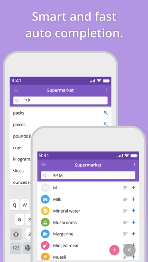ADD QUICKLY... thanks to large, expandable item collection of nearly 1000 categorized and prioritized articles and intelligent search function. When you enter the first letter, the corresponding item usually already appears. Or you can simply add items from your own history. Quantities, units and categories are automatically recognized – even when using voice input.