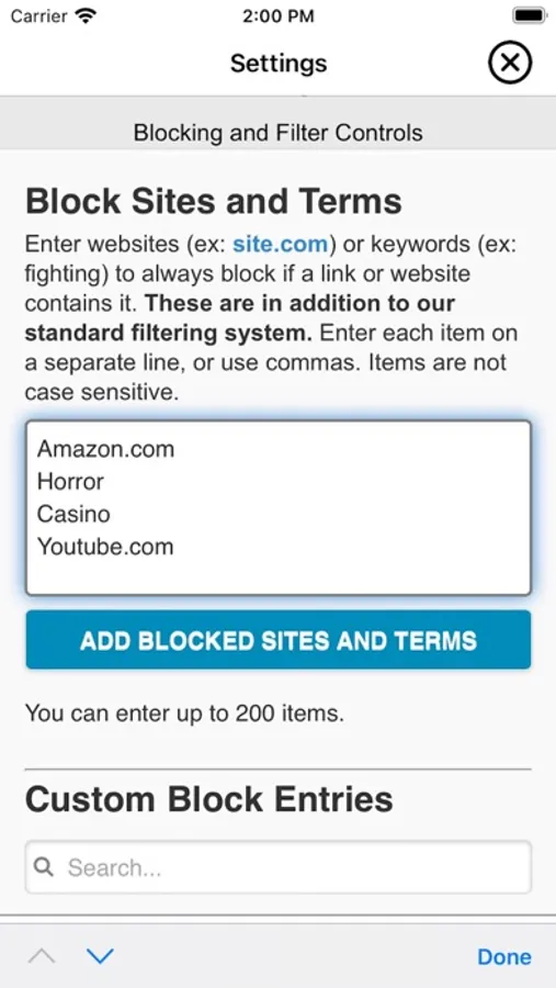 All search terms are checked against our proprietary filtering algorithm and database for safety. In addition, websites visited are screened for safety before they can be shown. Users can sign up for an optional free account that lets them add additional websites or keywords they want blocked. YouTube filtering can also be set to standard safe search, YouTube Kids only, or blocked.