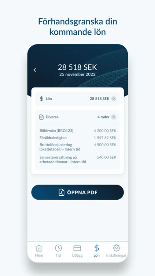 - Most users can also approve their salary report in the app. (Does not apply to e.g. some users with specific car-related benefits.)