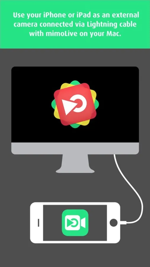 mimoCam enables the use of the iPad or iPhone connected to a Mac via Lightning cable to work as an external camera for the live switching app mimoLive on the Mac. In contrast to other camera apps, mimoCam doesn't show controls on the screen, giving you a clear picture.