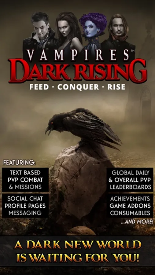 Vampires Dark Rising is a text-based, free to play, cross-platform, PVP role-playing game. VDR takes a fresh and exciting spin on the genre, introducing the story, characters and universe of a newly rising, vampire inhabited Darkside world.