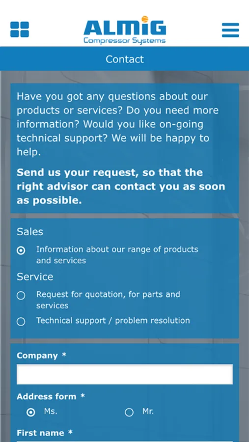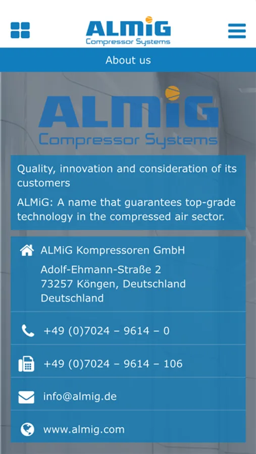 In case you need help or have questions about ALMiG products and services, the App provides a contact form, contact information and FAQs.