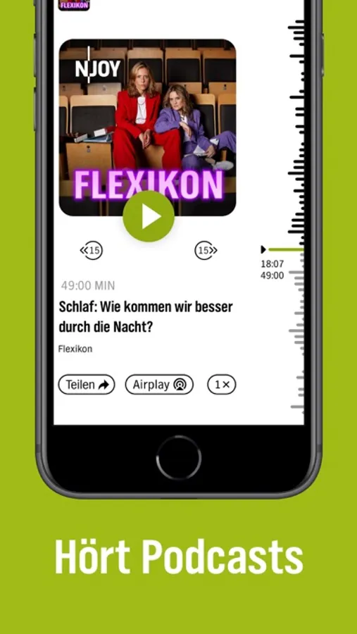 Alles auf einen Blick: Hört eure liebsten Radiosendungen, Musiktitel, DJ-Sets und Podcasts in der N-JOY App. Über die Titelliste seht ihr auf einen Blick, welcher Song aktuell im N-JOY Radio läuft oder wann ein bestimmter Musiktitel zuletzt lief. Ihr seht auch welche Moderatoren gerade für euch im N-JOY Studio stehen, welches Gesicht zu welcher Radiostimme gehört, oder von wann bis wann unsere Moderatorinnen und Moderatoren senden. So habt ihr den kompletten Überblick über das N-JOY Musikprogramm. Egal, ob ihr gerade in Norddeutschland oder woanders unterwegs seid, habt N-JOY immer dabei und hört eure Lieblings-Podcasts wie das „Flexikon" oder „Deutschland 3000 – Eine Stunde mit Eva Schulz“ direkt in der kostenlosen N-JOY App.