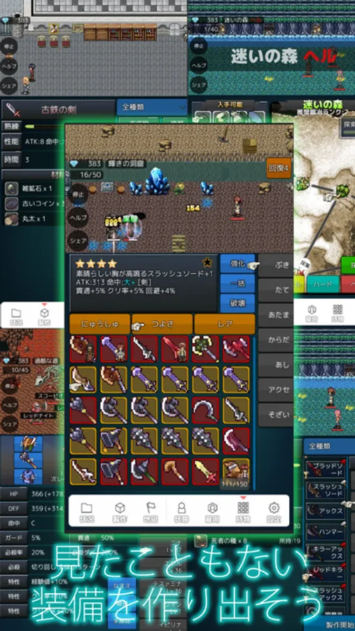 ・素材入手スピードを早めたり、製作品質を向上させる等の特殊な装備品も製作可能