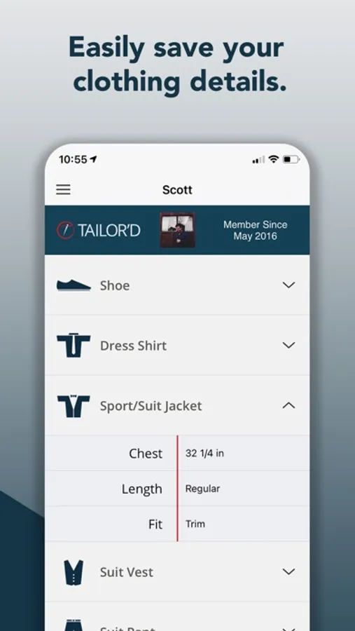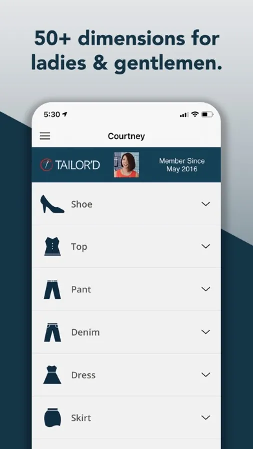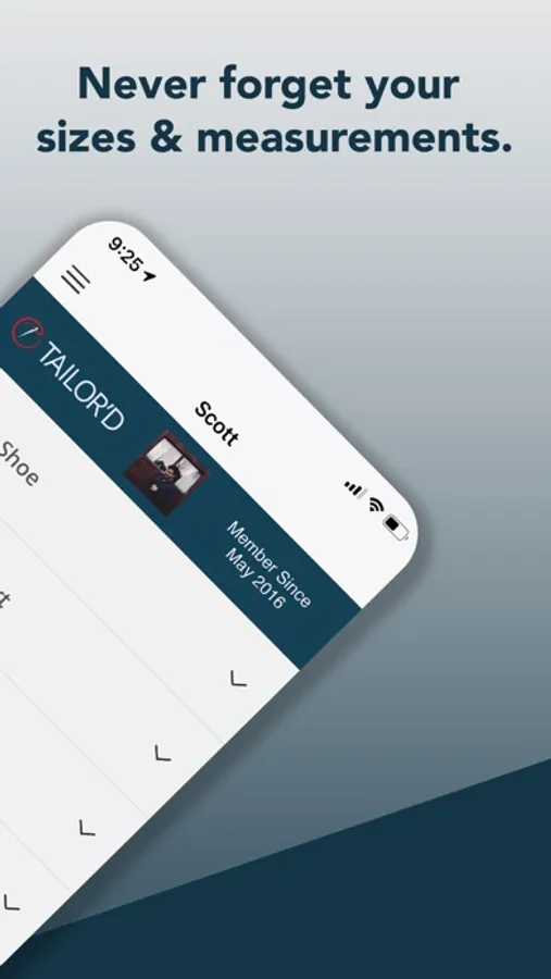 Easily store and share your clothing measurements! TAILOR'D is the iPhone app that keeps track of all your hard-to-remember clothing measurements (suit, lingerie, ring, hat) and everything in between (shirt, shoe, denim). Download today.