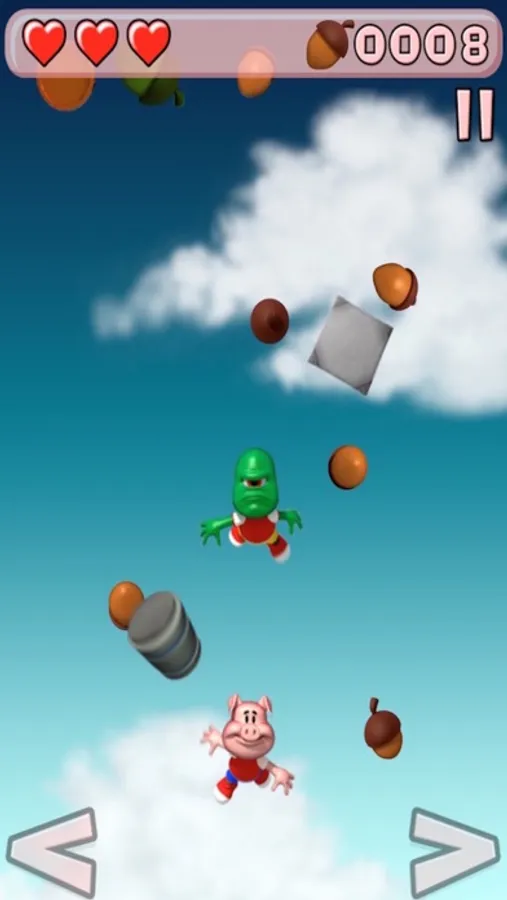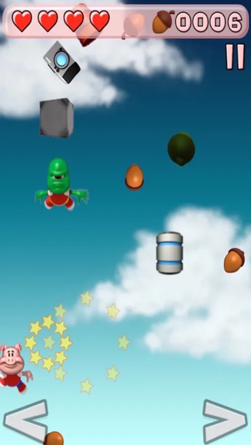 So now "Piggy" a little pink pig fly to recover all the acorns and defeat the evil Aliens to bring back the peace.