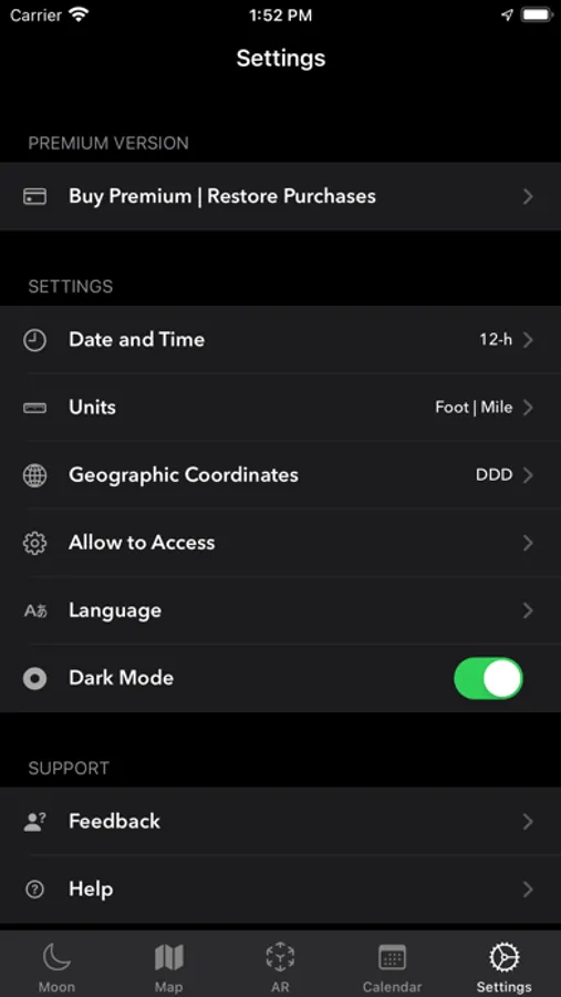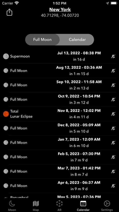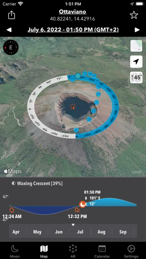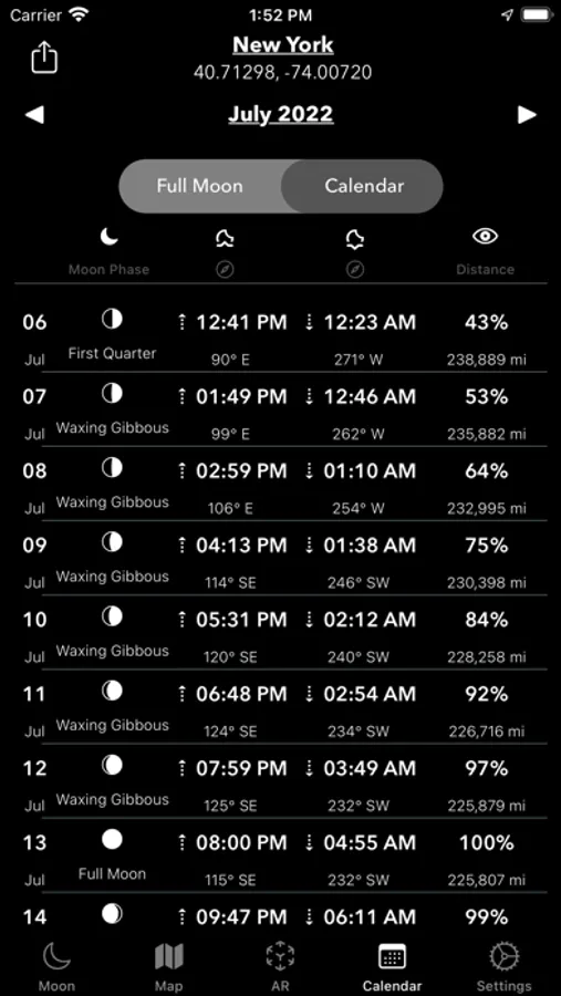 The free version of the app shows all information about lunar positions for your current time and location only.