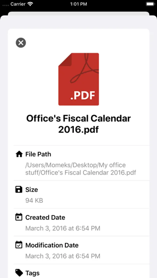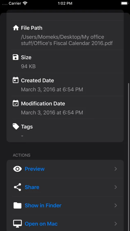 View general information like Size, Created/Modified dates, tags, and file path.
