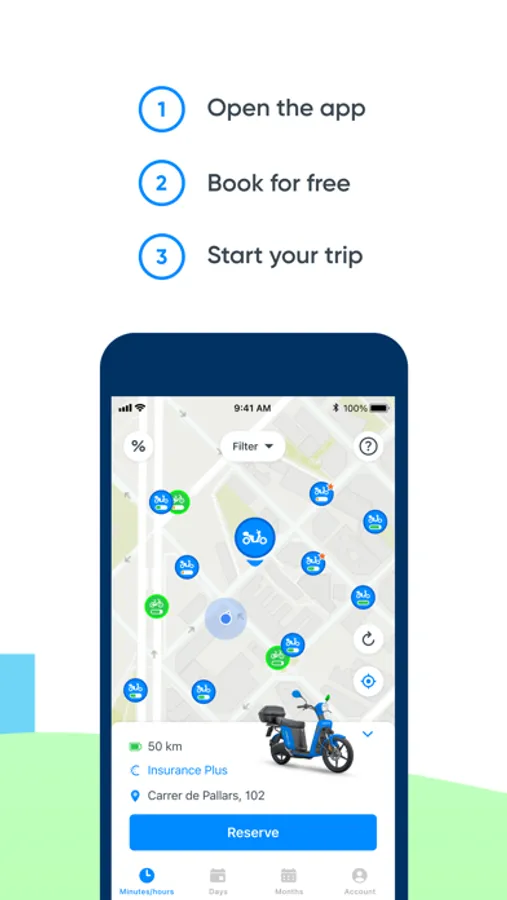 1) Locate the nearest rental motorcycle on the map of the app and press the ""Reserve"" button.