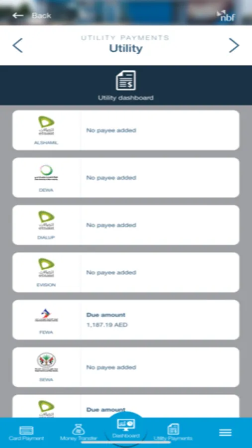 • Make utility payments for Etisalat, FEWA, DEWA or SEWA